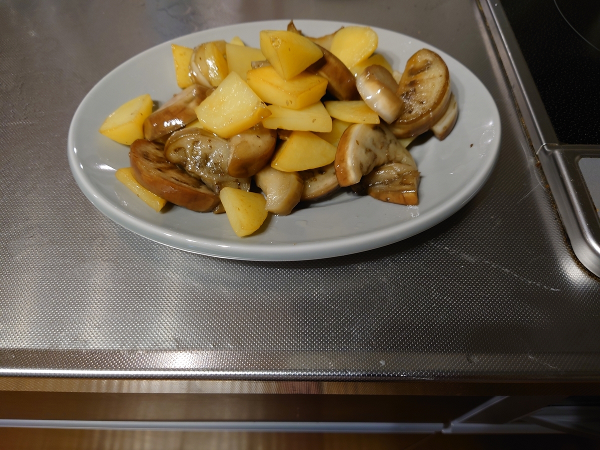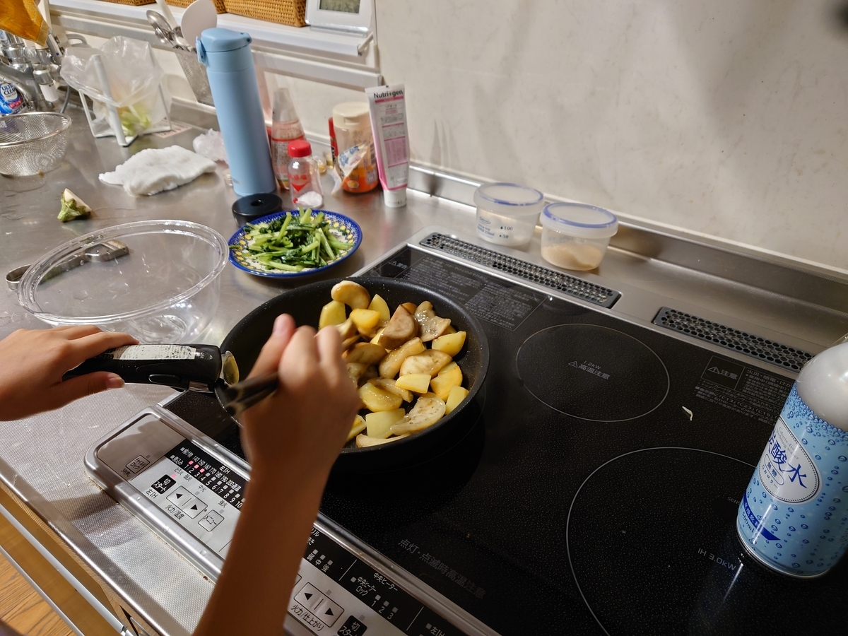じゃがいもと白茄子を塩コショウで炒めていました。切るところから、ぜーんぶ長女一人です。